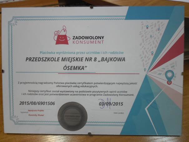 Certyfikat Zadowolonego Konsumenta 05 October 2015 ZOSTALIŚMY WYRÓŻNIENI PRZEZ RODZICÓW I WYCHOWANKÓW WSPANIAŁYM CERTYFIKATEM DZIĘKUJEMY tweet