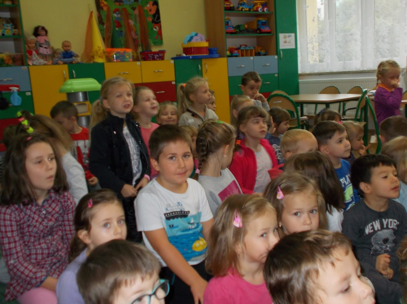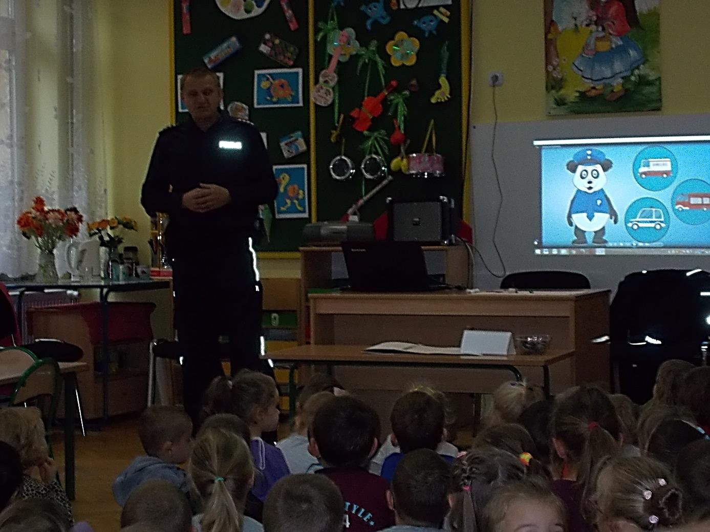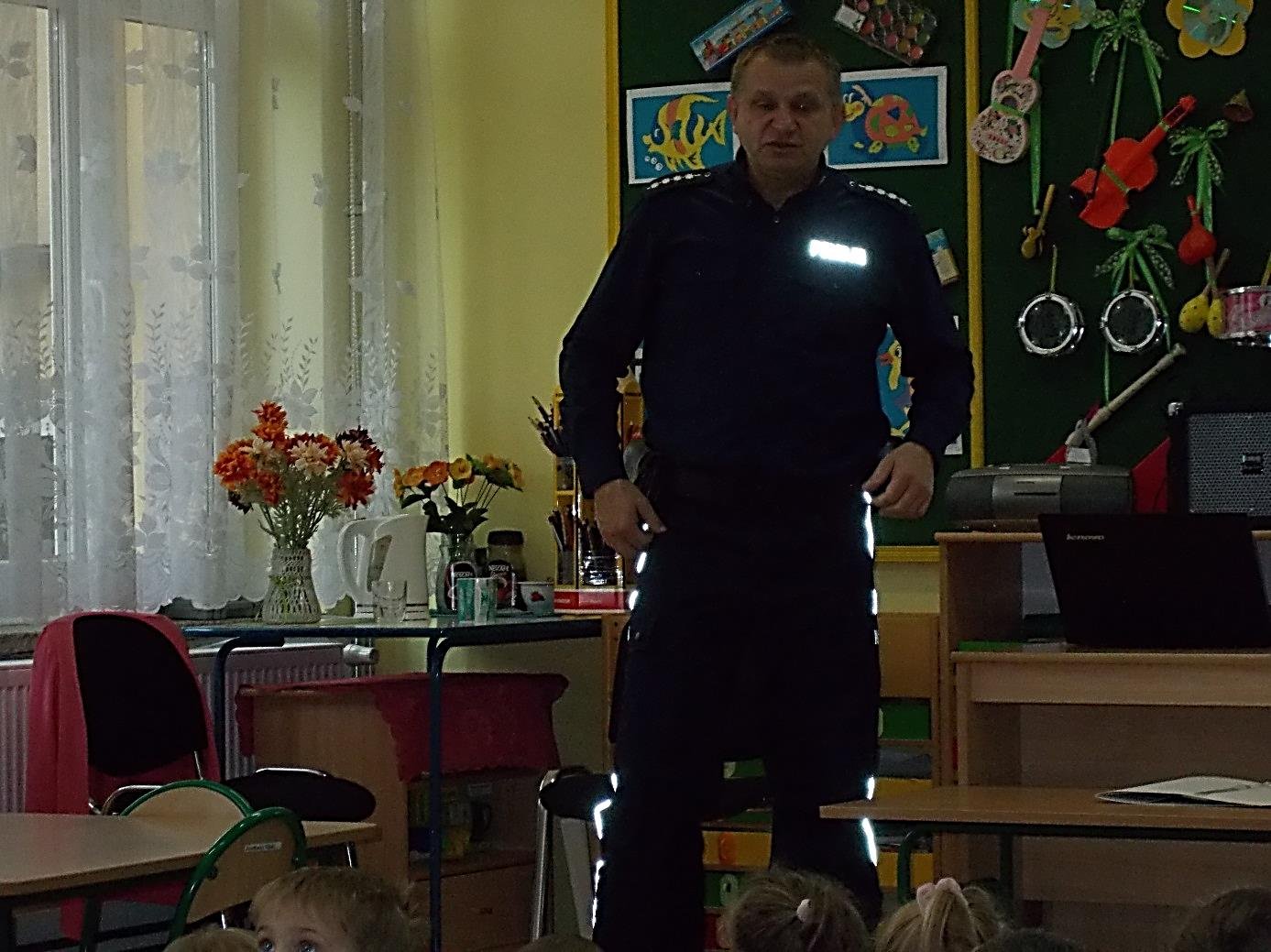 Dlatego zaproszony pan policjant przypomniał dzieciom, by unikać kontaktów z obcymi osobami i nieznanymi zwierzętami, jak reagować na zagrożenia codziennego życia w domu i na podwórku. Ponadto dzieci dowiedziały się jak przebiega i na czym polega służba policjanta, zdobyły wiedzę, że każdy policjant jest przyjacielem dzieci, jak go rozpoznać na ulicy i że zawsze można zwrócić się do niego o pomoc.