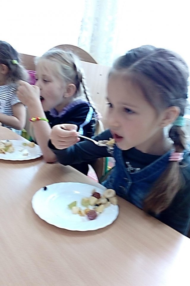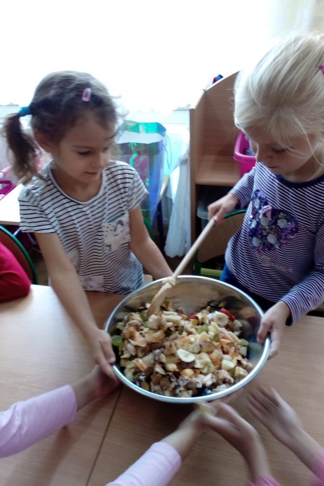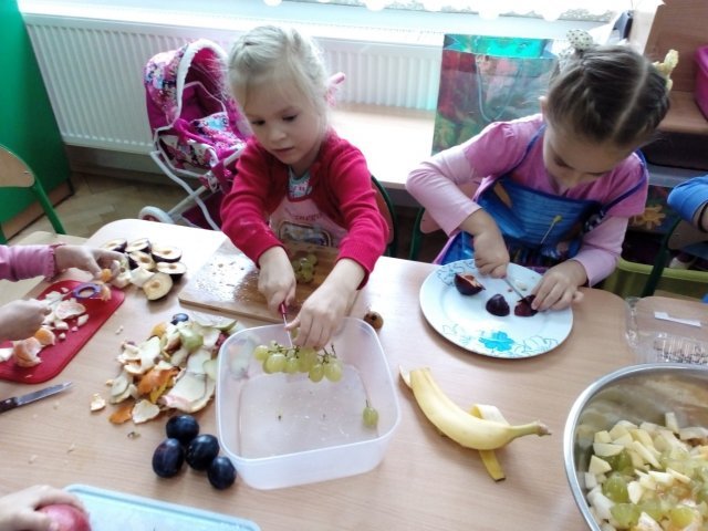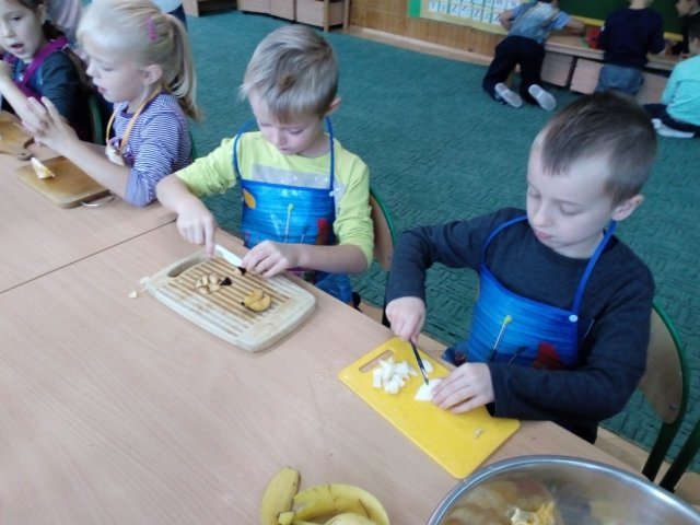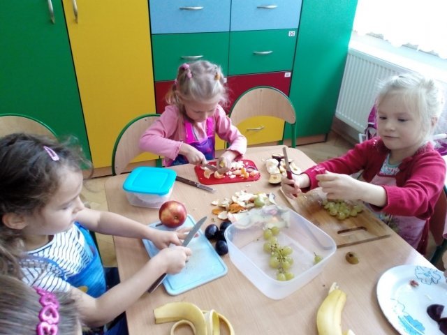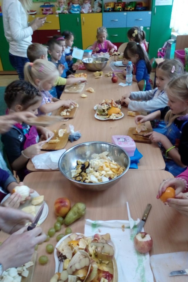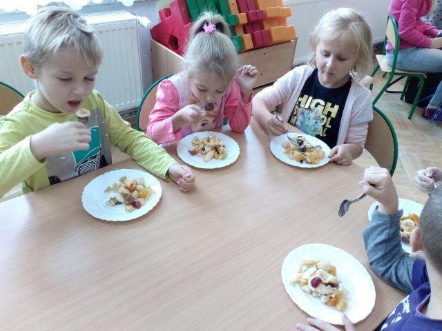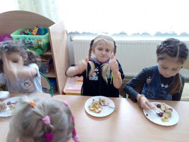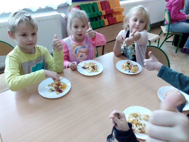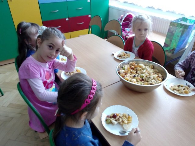 Zrobiliśmy ją samodzielnie i z ogromnym apetytem zjedliśmy. Poczęstowaliśmy naszą sałatką panie pracujące w kuchni przedszkolnej, aby miały dużo siły i tak, jak do tej pory gotowały nam pyszne obiadki i śniadanka.