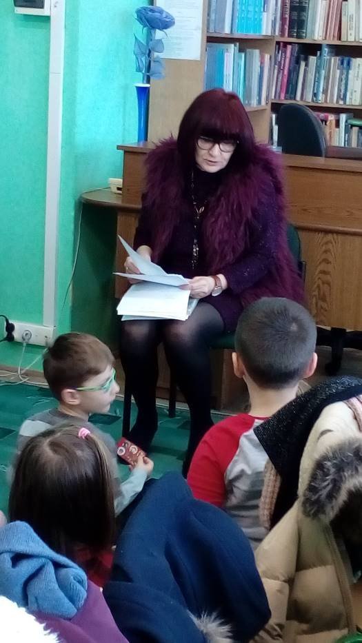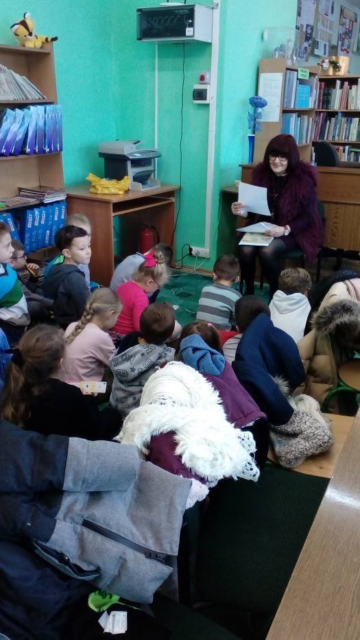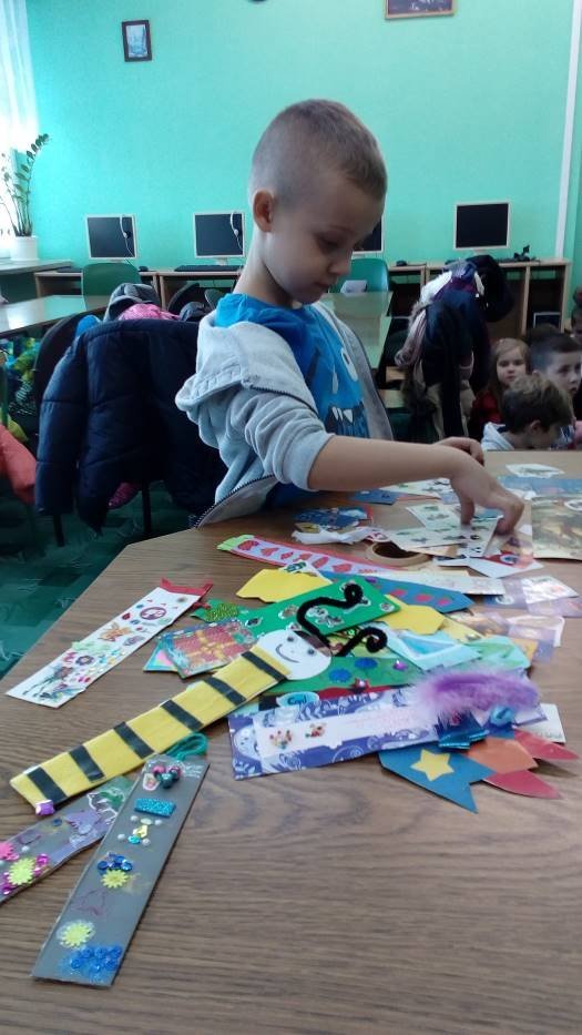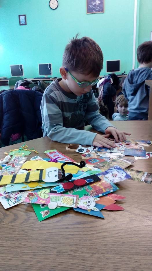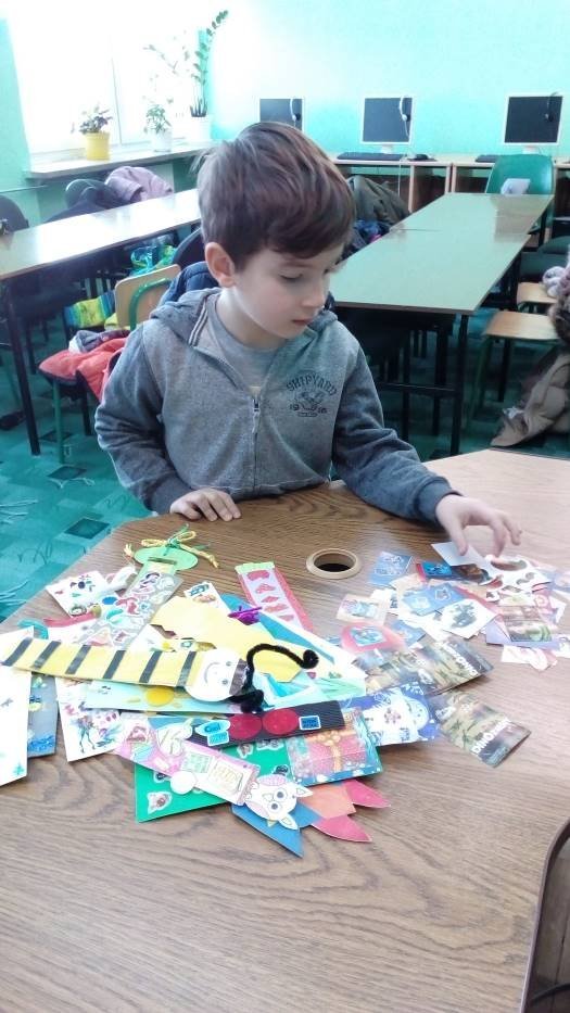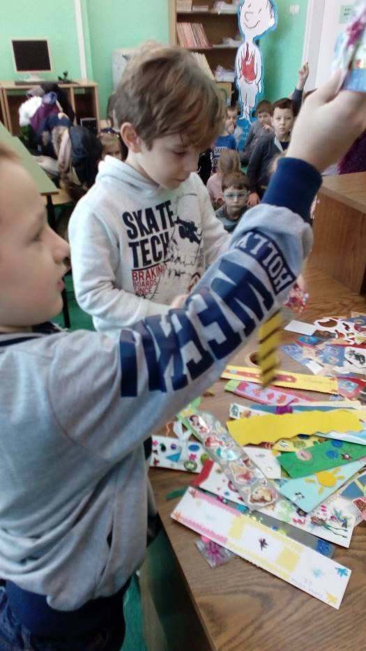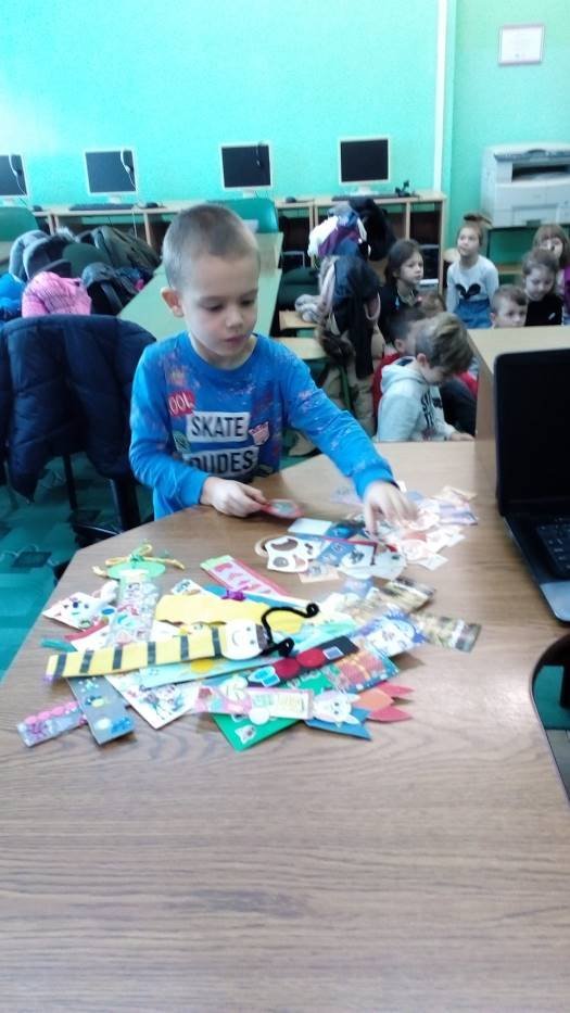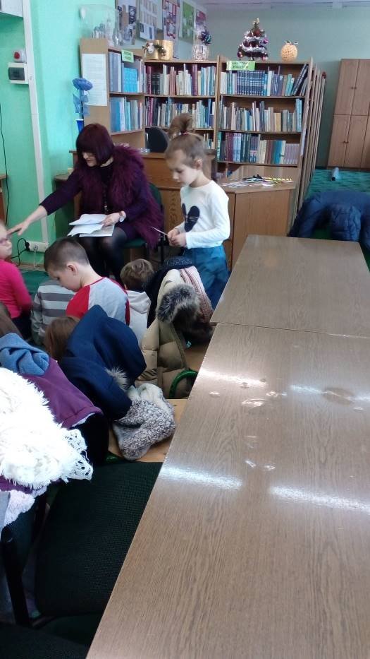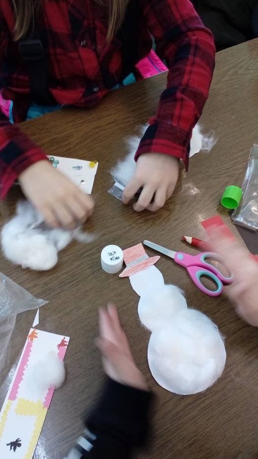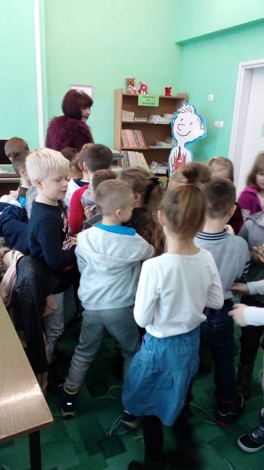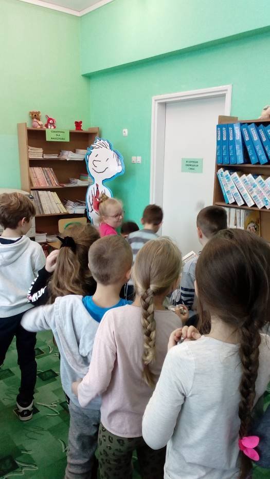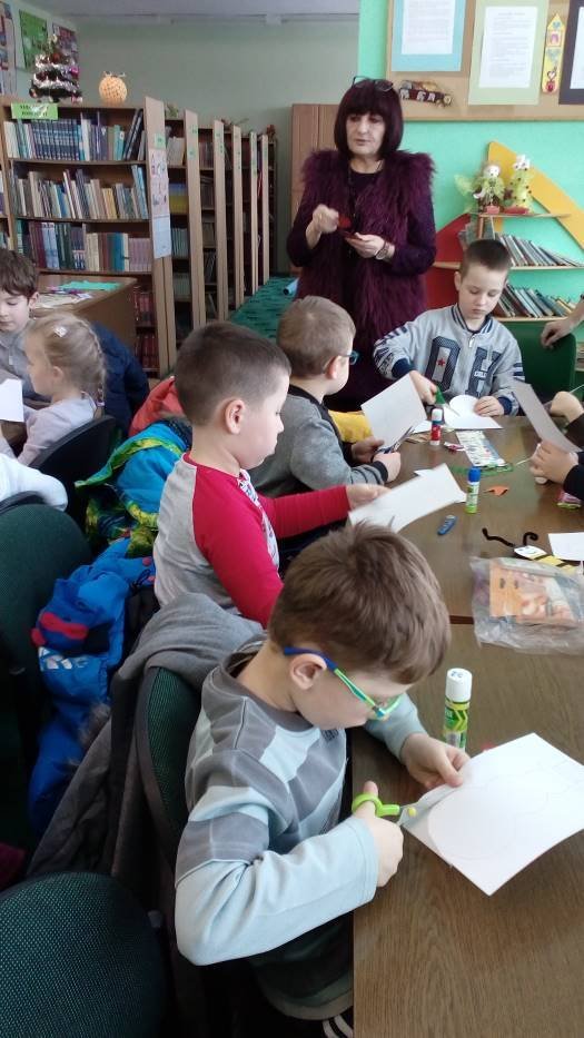 A „Smerfy” w cieplutkiej bibliotece rozwiązują zimowe zagadki i lepią papierowe bałwanki.