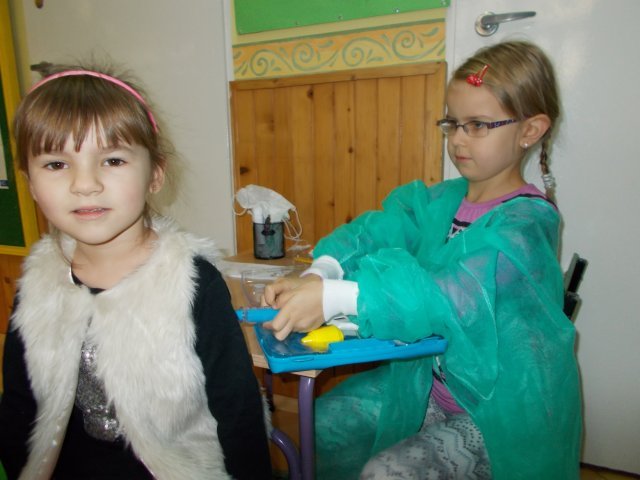 Urządziliśmy też w sali kącik lekarski i bawimy się w przyjmowanie i leczenie kolegów